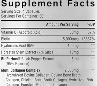 Vitamina C (50 mg) con el propósito de ayudar al cuerpo a producir hidroxiprolina, que es el componente más abundante en la síntesis de colágeno.