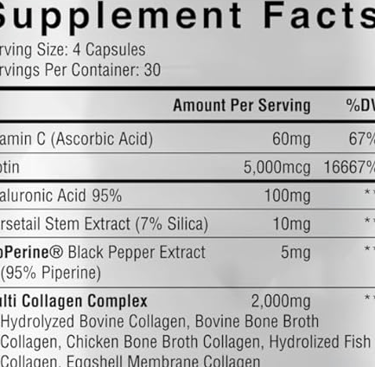 Vitamina C (80 mg) con el propósito de ayudar al cuerpo a producir hidroxiprolina, que es el componente más abundante en la síntesis de colágeno.